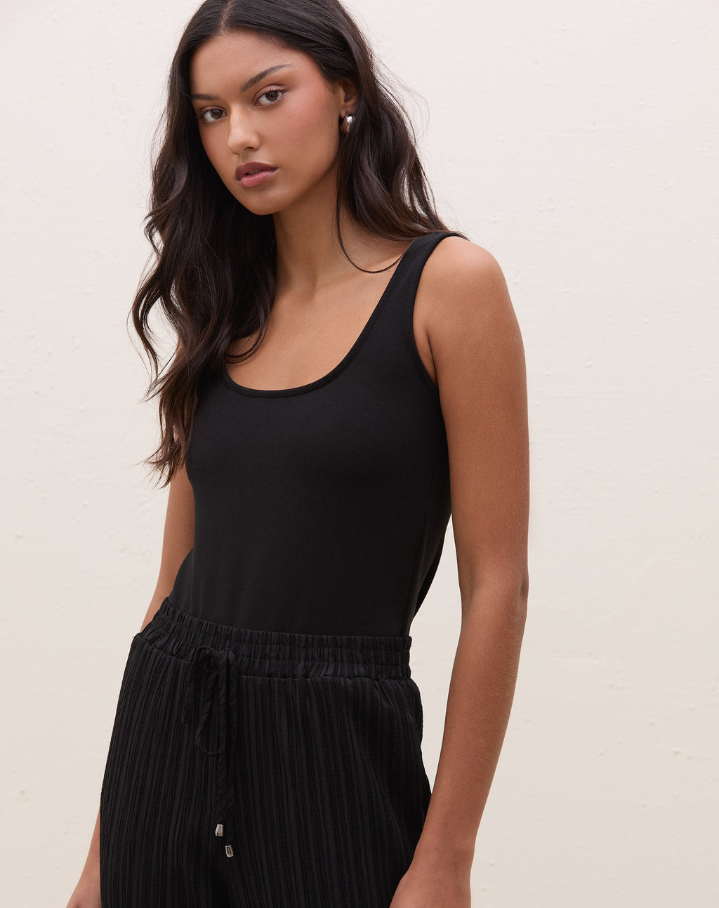 Body regata de malha creponada, peça versátil e cool para um look elevado. Ideal para ocasiões casuais e clima quente.