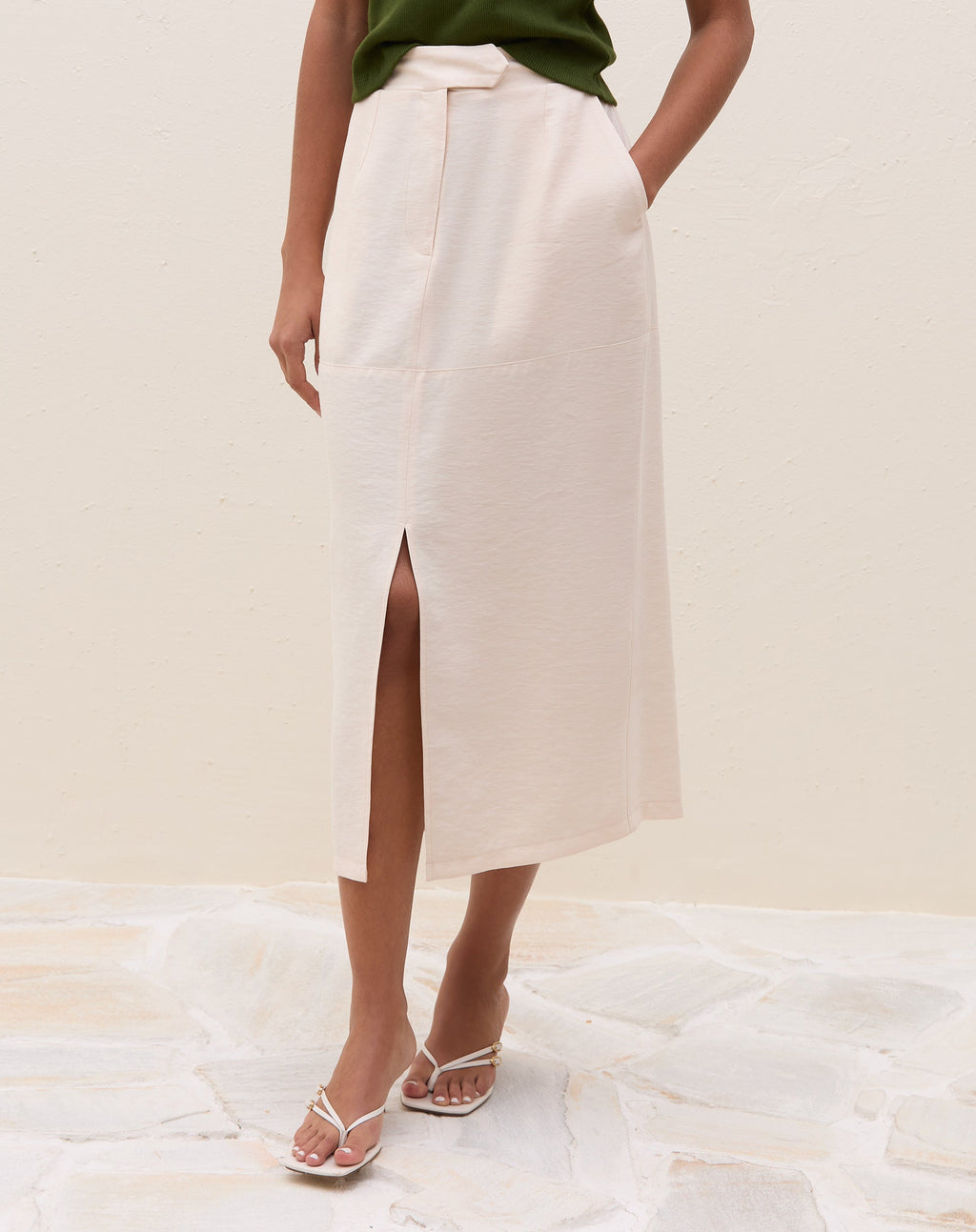 Saia midi com fenda frontal em alfaiataria, perfeita para um look elegante e moderno. Versátil, pode ser usada do trabalho ao happy hour, garantindo sofisticação e estilo.