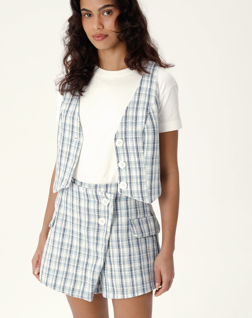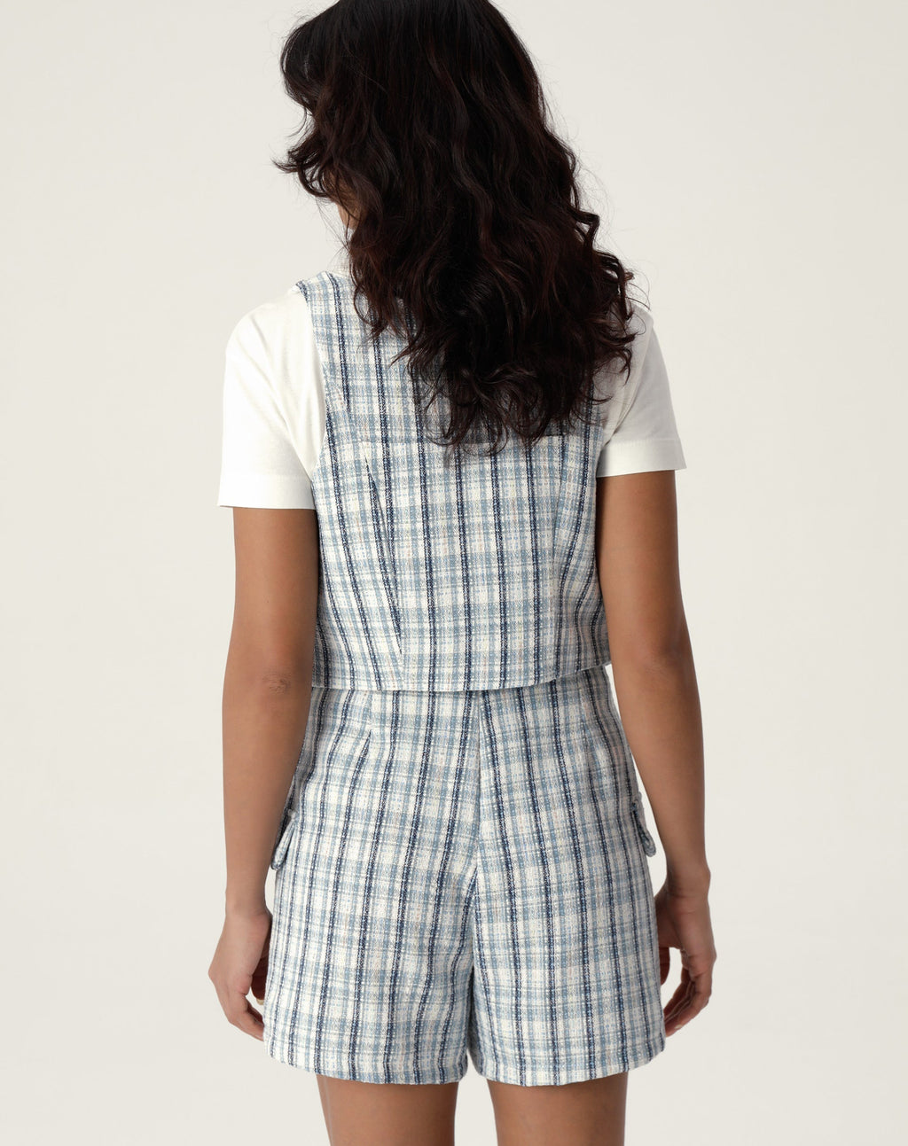 Um clássico reinventado! O colete de alfaiataria com decote em V é a peça-chave para um look elegante e moderno. Feito em tweed com estampa xadrez, é perfeito para compor um visual sofisticado e despojado ao mesmo tempo.