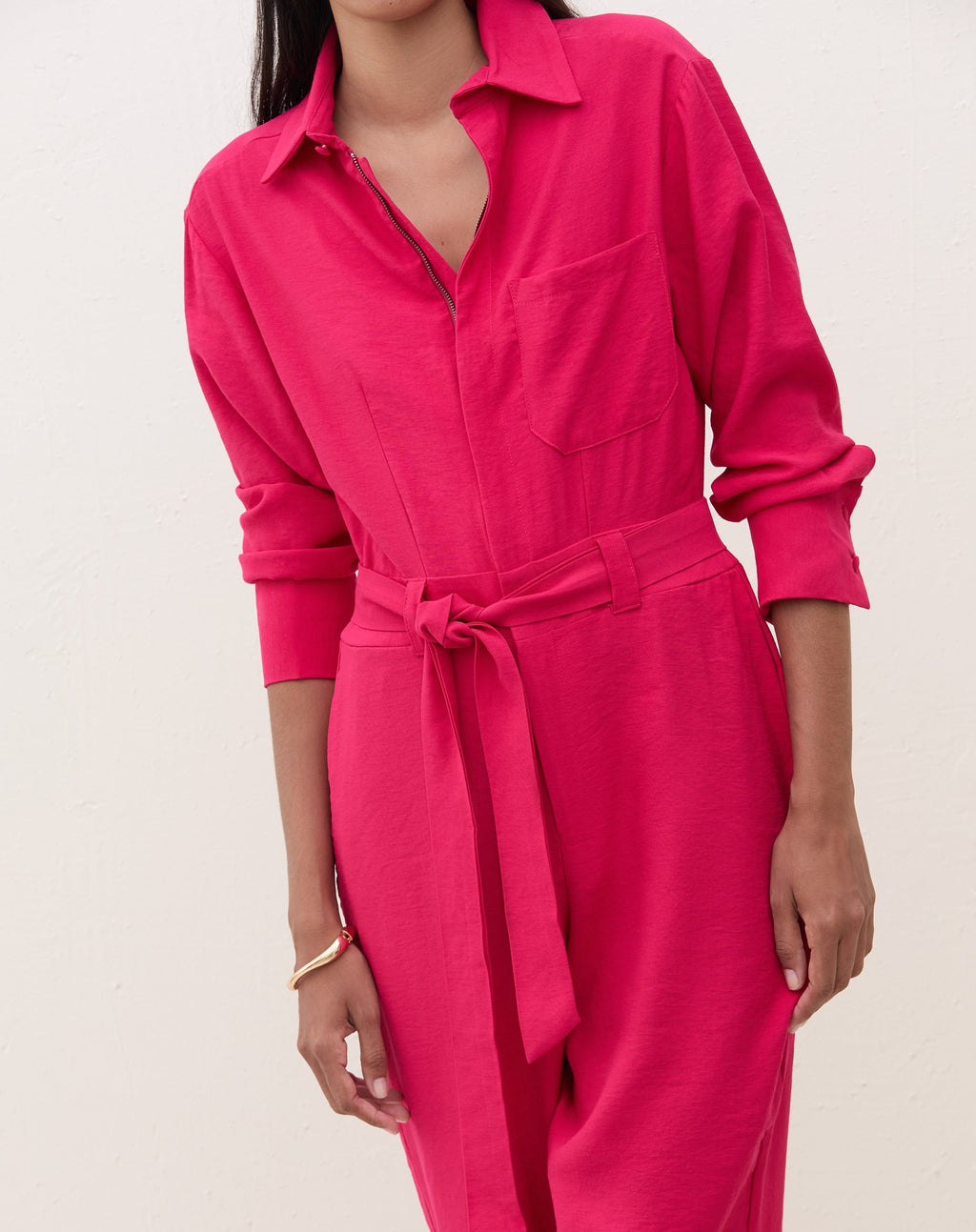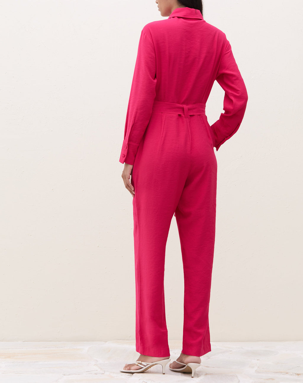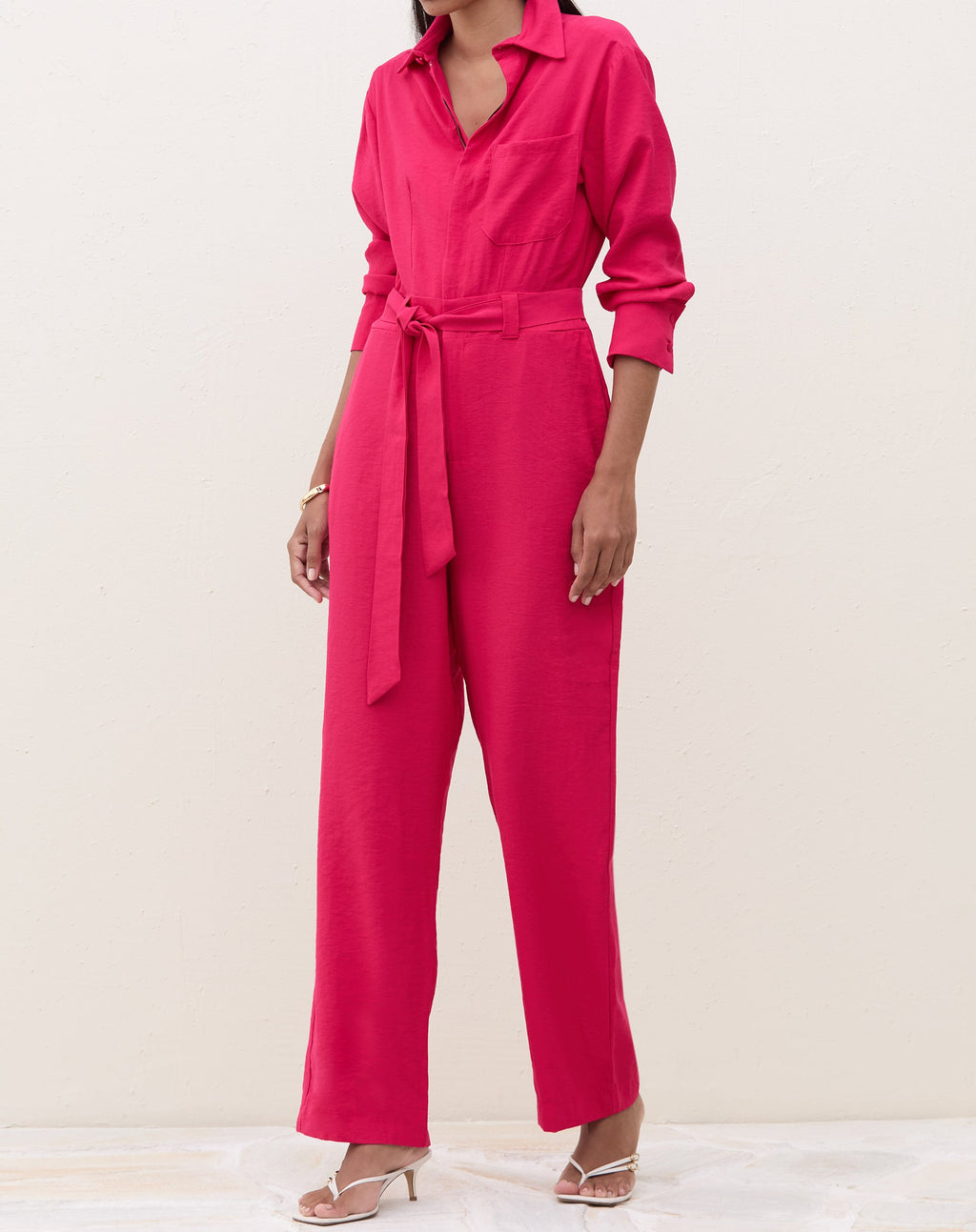 Macacão elegante e versátil, perfeito para um jantar especial. Com amarração na cintura e gola de camisa, é uma peça atemporal e sofisticada para mulheres modernas.